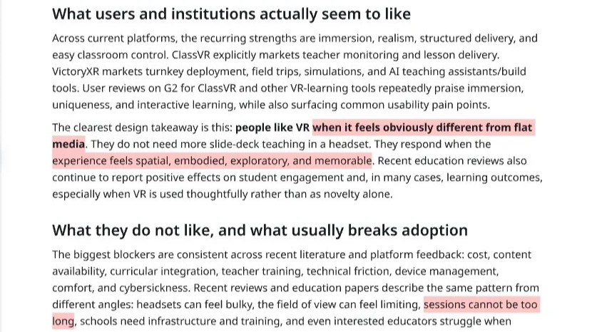 AI analyzed VR education products and identified gaps in interaction, content, and immersion.