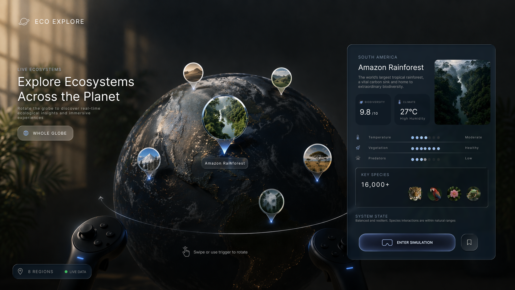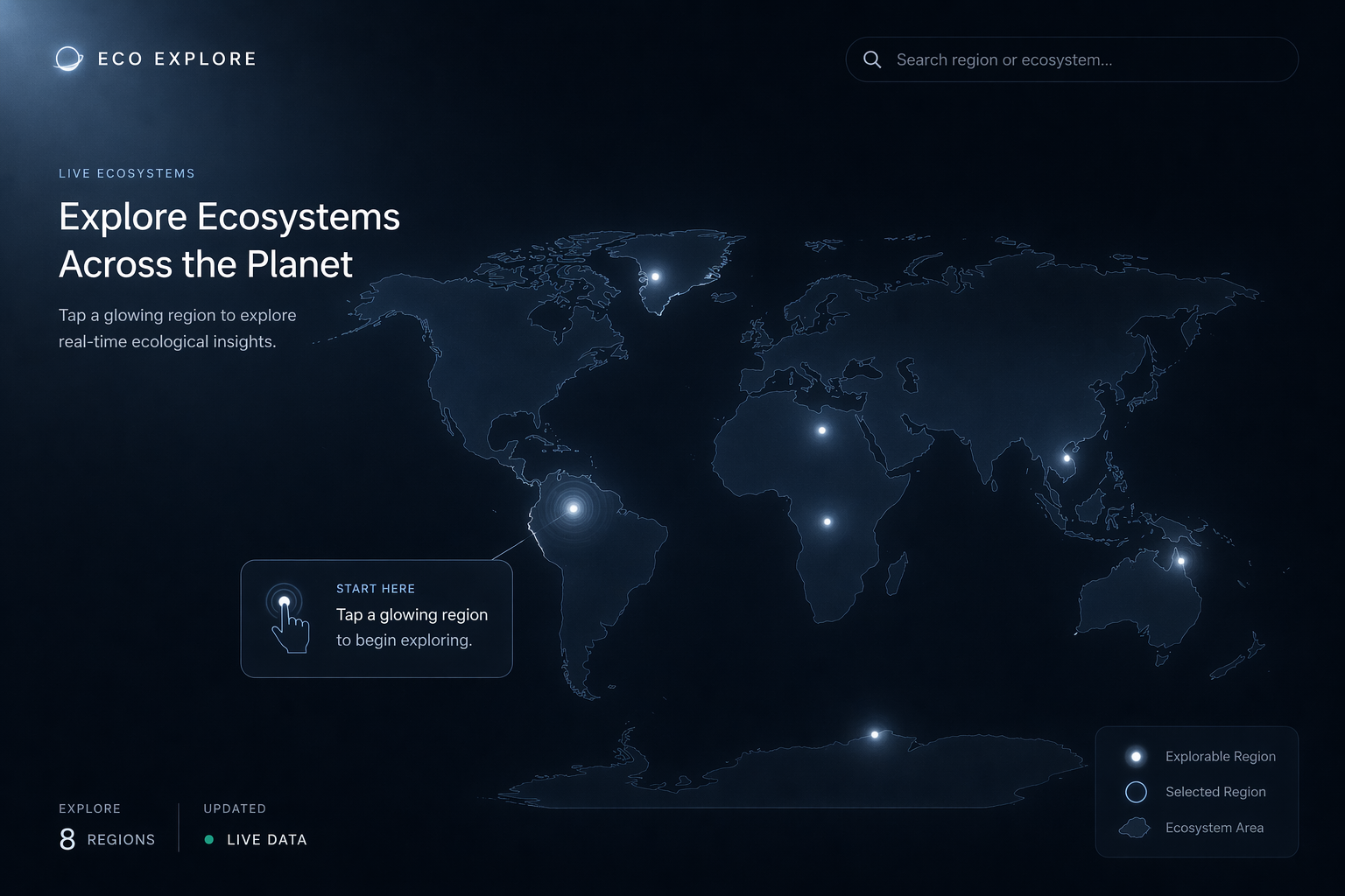 Users enter a living ecosystem where species, climate, and environmental conditions become visible.