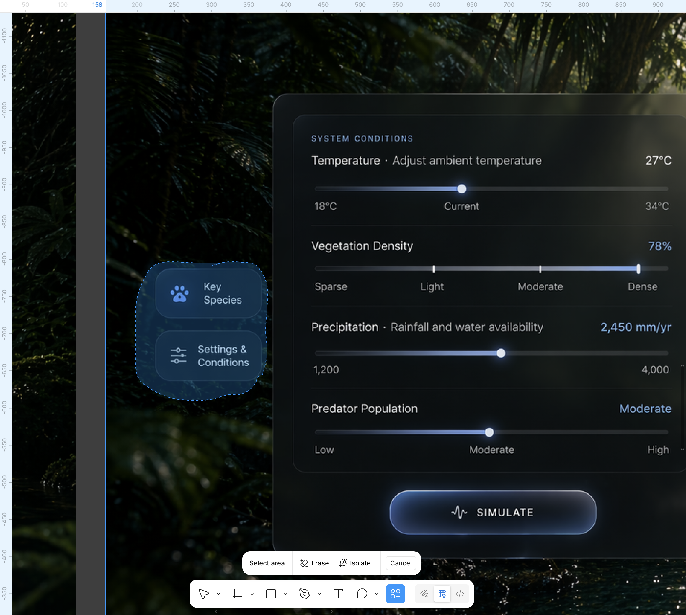 Users adjust variables such as temperature, vegetation, rainfall, or predator levels to test system responses.