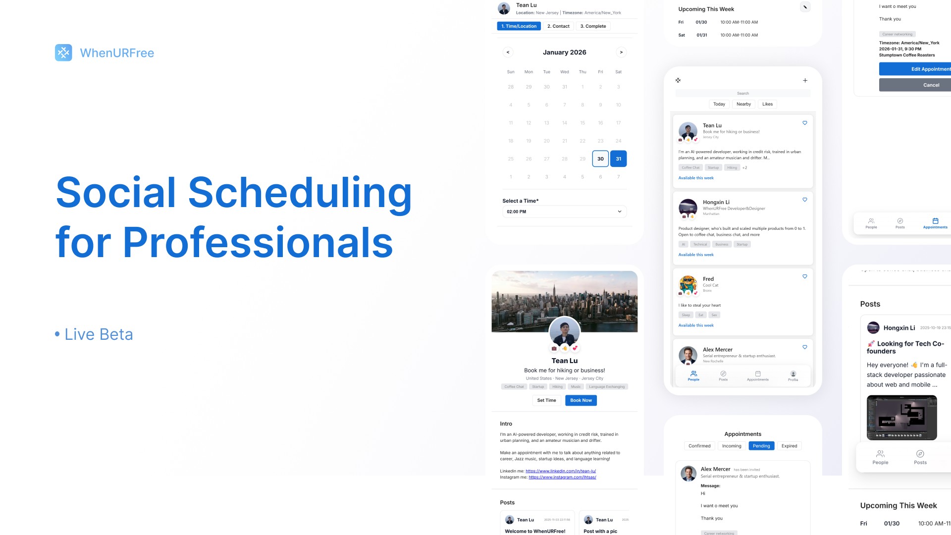 WhenURFree is a web platform designed to help people make meaningful, purpose-driven connections through a simple and intuitive meeting flow. Users can browse profiles, explore interest-based posts, and book meetups directly through a clean scheduling interface. The platform removes the overwhelming elements of traditional social apps by eliminating endless chatting and focusing instead on clear information, quick decision-making, and real, actionable meetups.